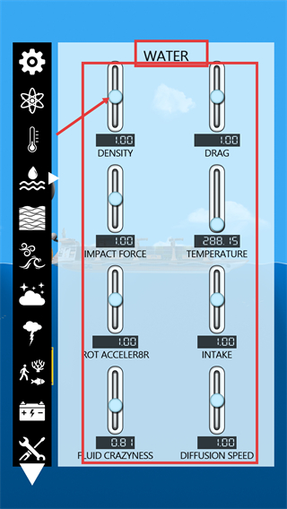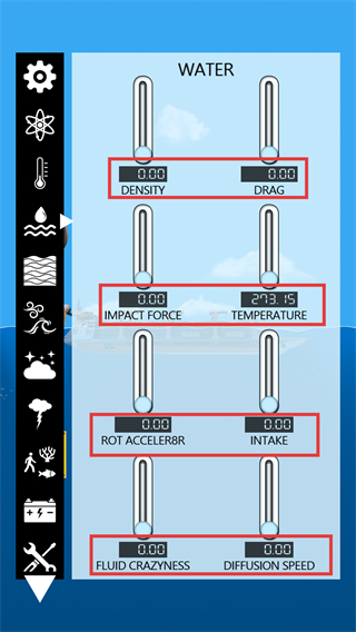 3、将【WATER】相关参数(如密度、阻力)调至0.00,可改变水域环境的运行规则,适配特殊操作需求。