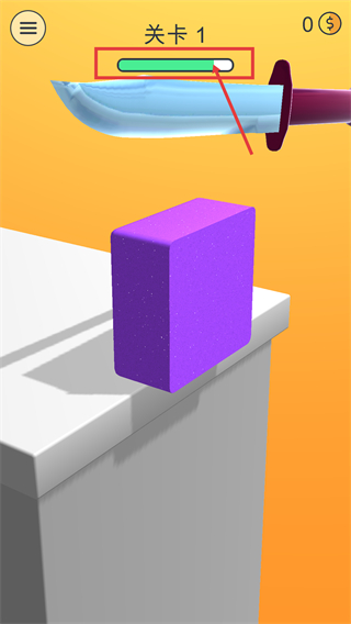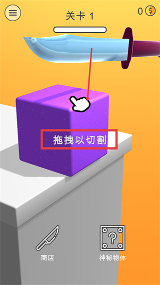 1、在关卡中按照提示【拖拽以切割】操作刀具,对紫色方块进行切割,推进关卡进度。