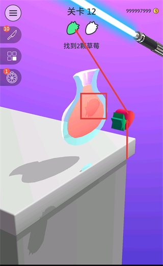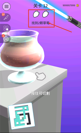 2、【关卡12】的目标是【找到2颗草莓】,需通过【按住可切割】操作,逐步剖开物体寻找目标。