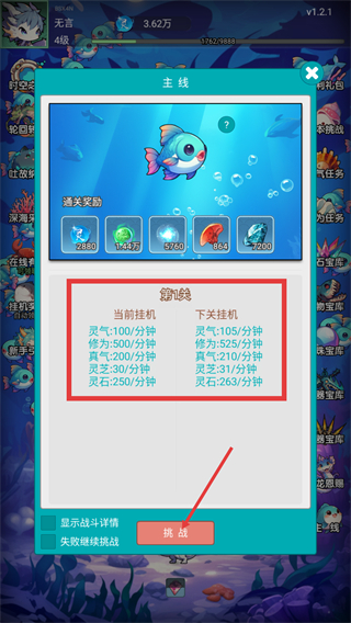 1、挑战【第1关】前查看【当前挂机】与【下关挂机】收益,确认后点击【挑战】按钮开启关卡,可获取对应通关奖励。