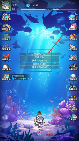 4、通关后可获得【修为x1.44万】【真气x5760】等奖励,同时达成【升级成功】,可用于提升角色等级与属性。