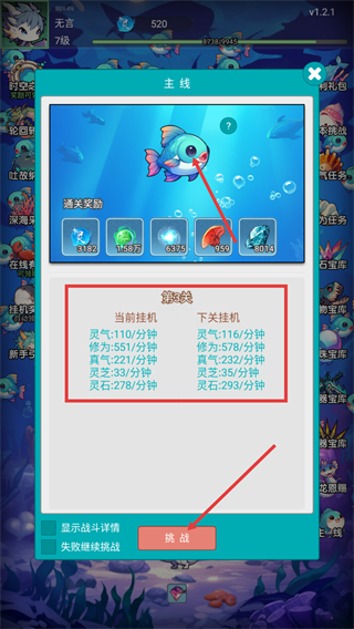 4、挑战【第3关】前确认【当前挂机】收益,点击【挑战】按钮通关后,可获取更高的【下关挂机】资源收益。