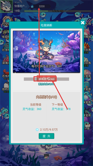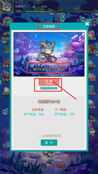 1、在【吐故纳新】界面点击【吐纳】按钮,每次可获得【360】灵气,利用剩余内息批量获取资源,用于后续养成。