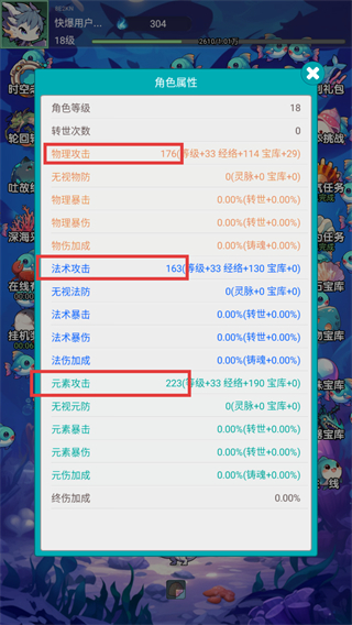4、查看【角色属性】面板,了解【物理攻击】【法术攻击】【元素攻击】的数值构成,针对性强化对应系统提升战力。