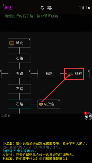 1、在【石路】场景中找到【林府】入口,进入前可获取【小火球术-x1】,该技能可用于后续战斗输出。