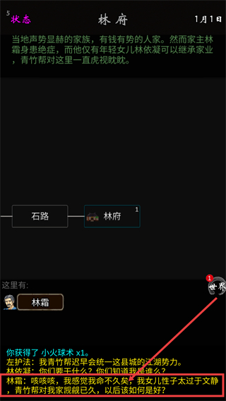 2、进入【林府】后找到【林霜】,其为林家家主,当前身患病重,后续可通过交互推进与林家相关的剧情。