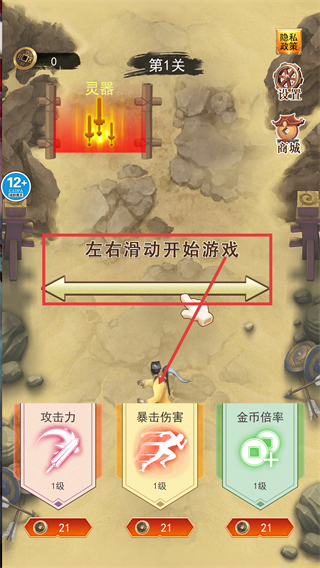 1、进入【第1关】后,按提示【左右滑动开始游戏】,可先升级【攻击力-1级】等属性提升战力。