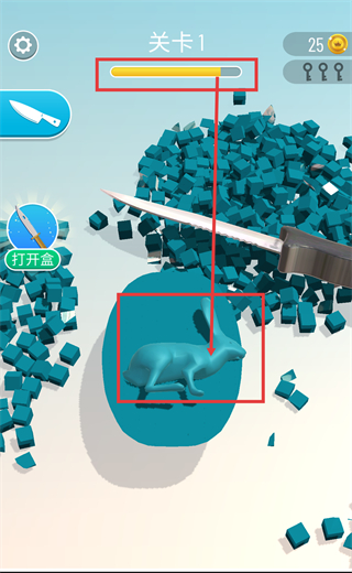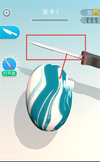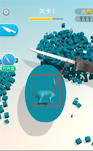 1、在【关卡1】中,使用界面中的刀具道具,对目标物体进行切割操作,推进关卡进度。