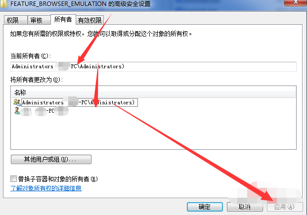 还需要注意查看一下你所持有的用户administrator是否为当前所有者,如果不是的话将它切换为当提前所有者后在点击应用。