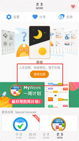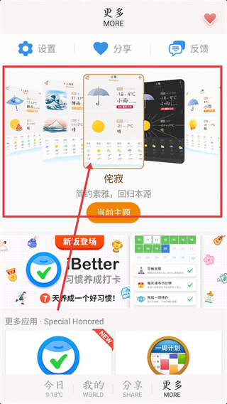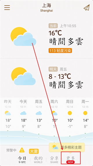 1、在天气应用主页面点击底部的【更多】选项,就能进入主题选择页面,查看各类界面风格主题啦。