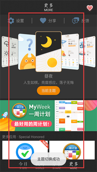 4、点击【使用主题】后会收到【主题切换成功】提示,界面会同步更新为【昼夜】主题的样式哦。