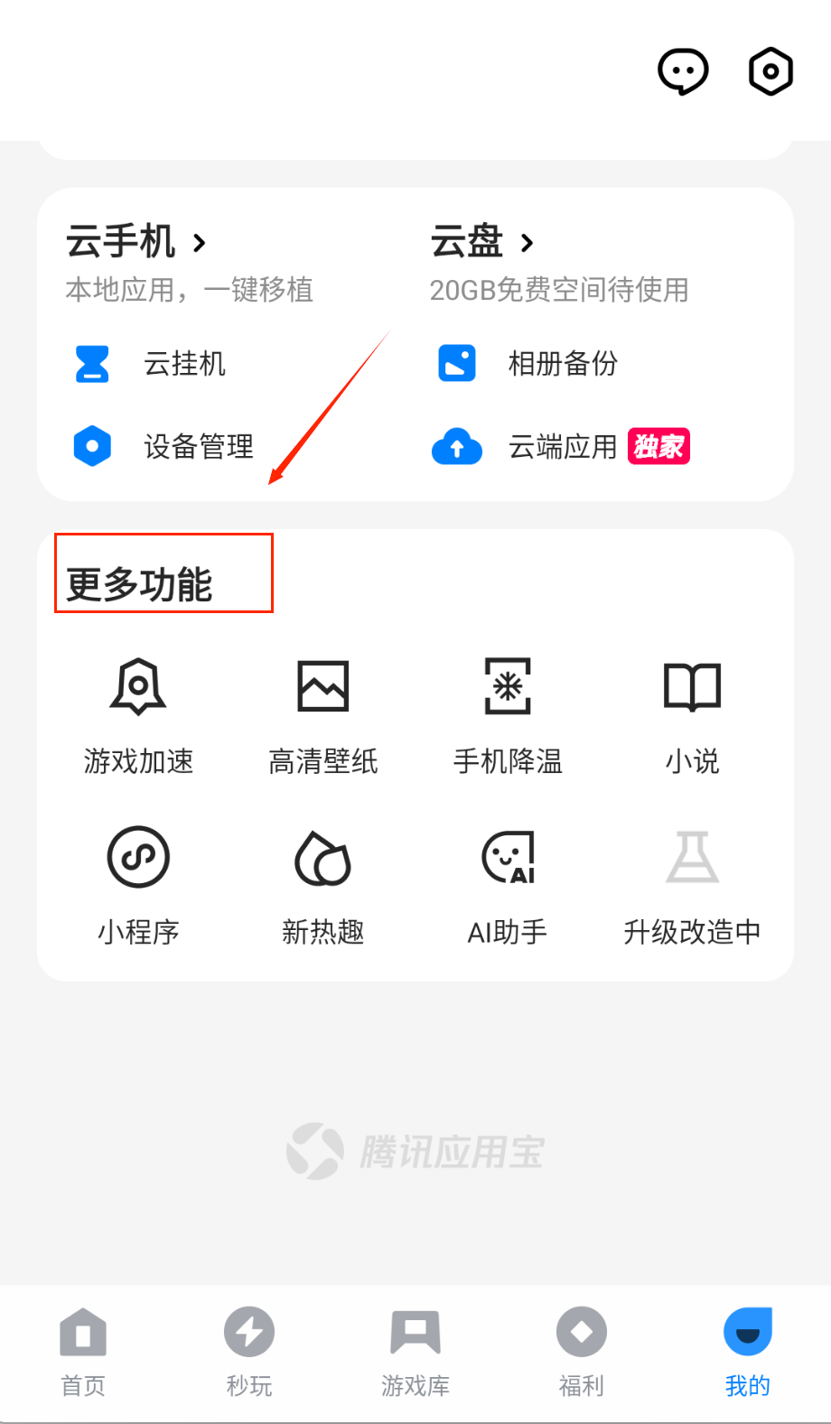2、软件提供了20GB免费云盘空间,你可以在"更多功能"里找到它,用来备份相册或重要文件,还能把本地应用一键移植到云手机,真的很方便。