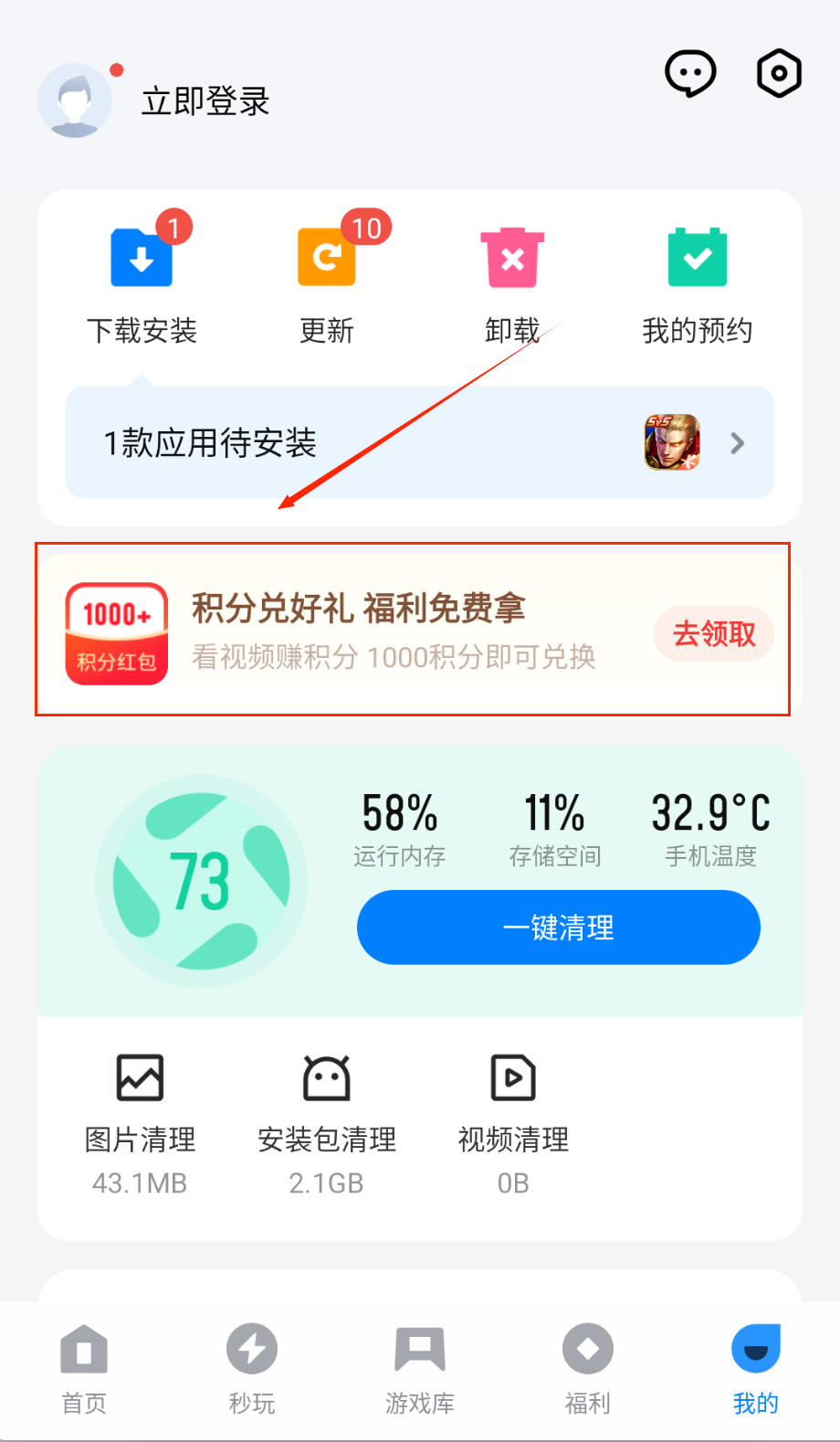 1、在"福利"或"我的"页面可以找到手机清理功能,它能一键释放内存、清理安装包和图片,还能实时监控手机温度和存储空间。