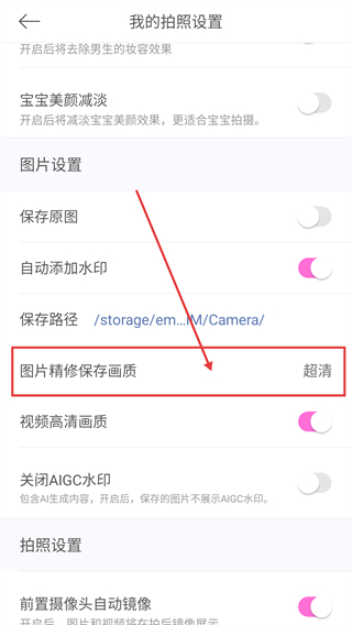 3、在我的拍照设置页,点【图片精修保存画质】选项,能进入画质选择界面,选喜欢的画质啦。