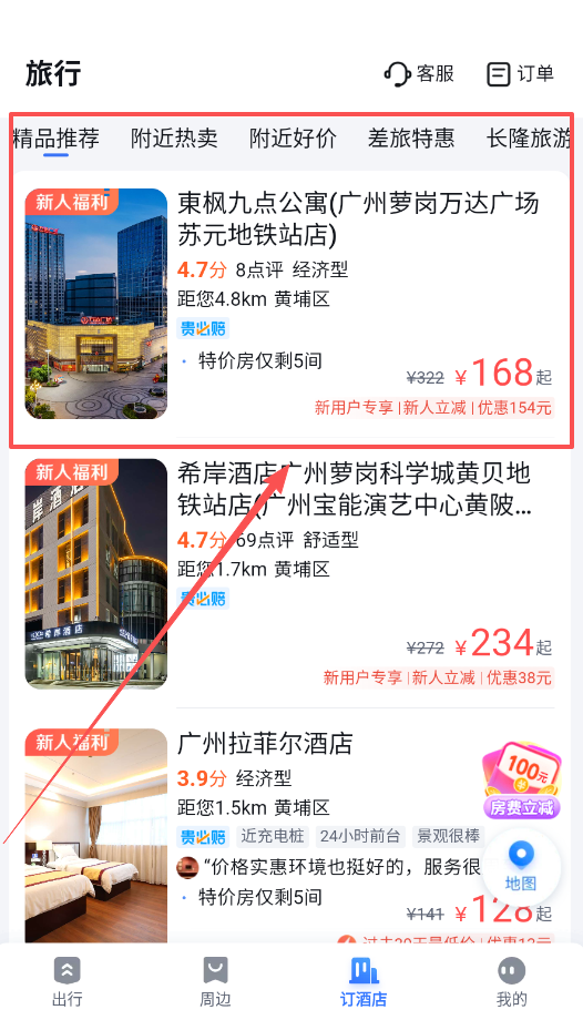 4、预订酒店优先使用日期和价格星级进行筛选,并使用地图工具直观选择位置合适的酒店。
