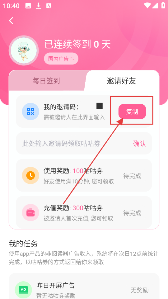 3、在邀请好友界面点击【复制】,就能把邀请码复制到剪贴板,方便分享给好友哦。