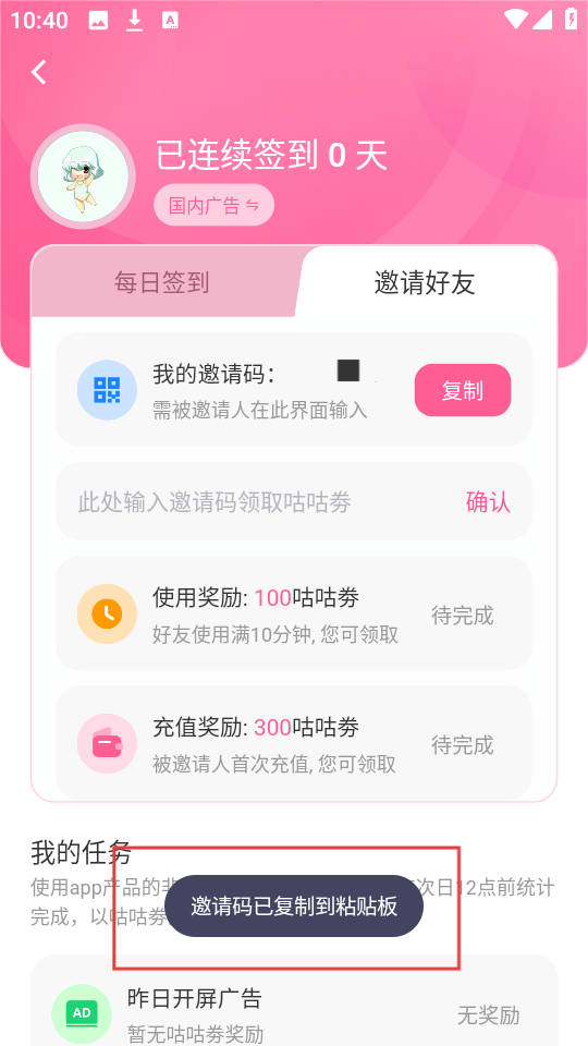 4、复制邀请码后,就能分享给好友,邀请他们使用,还能领取奖励哦。