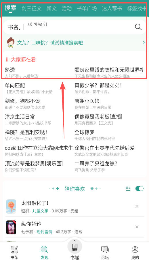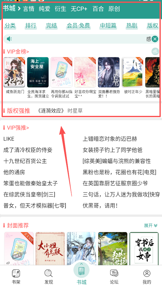 2、找书其实很方便,主页“发现”和“书城”里有超多选择,书城还细分为言情、纯爱等类型,VIP金榜和封面推荐里的书质量都很高。