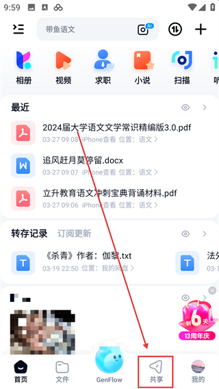 1、在文件管理应用首页,点底部【共享】选项能进入共享功能页,可处理文件分享相关操作哦。