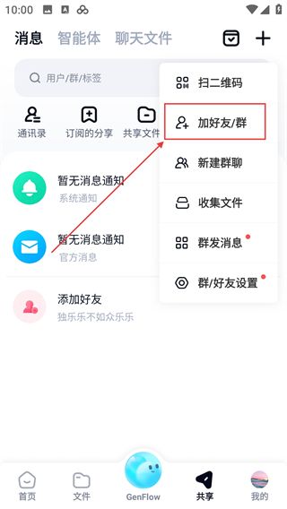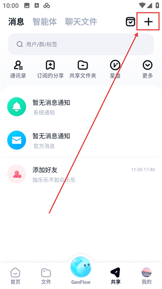 2、进入共享页后,点右上角加号按钮,能展开功能菜单,找到添加好友或群的相关选项啦。
