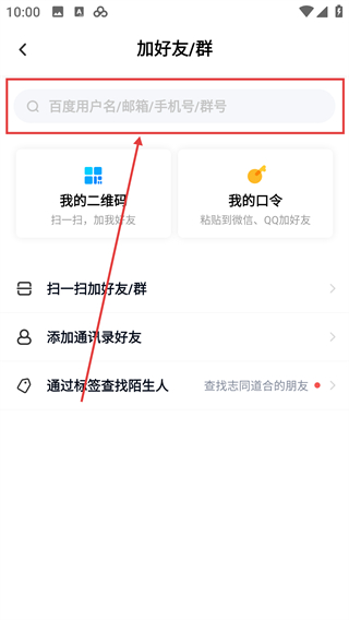4、在加好友/群页面,可通过搜索框输入信息,或用二维码、口令等方式添加好友或群哦。