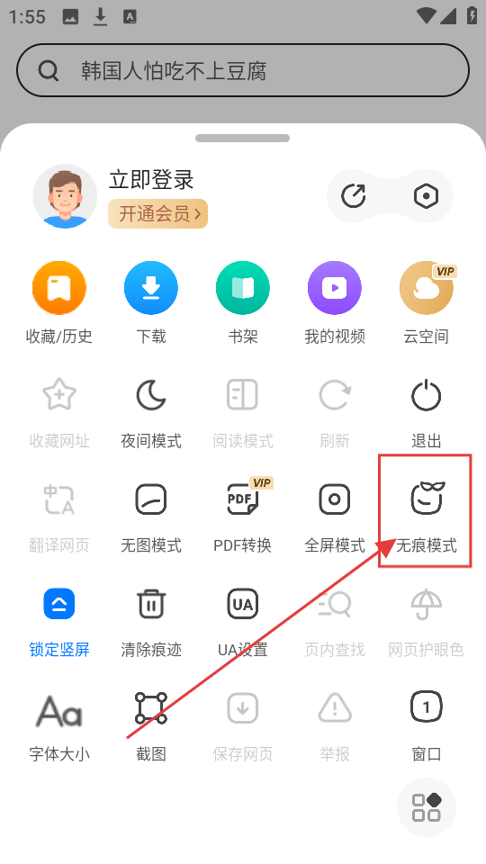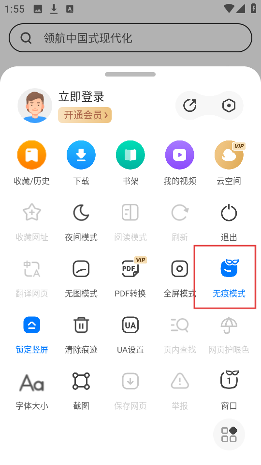 2、在功能菜单中,找到【无痕模式】选项并点击,弹出无痕浏览开启提示框哦。