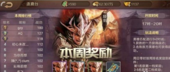 1.逐鹿之战:每天的下午五点开始到晚上八点钟。每人每天有免费的两次进入参加比赛的 ,比赛2v2制,胜的一方可以抽奖励,存活到最后两位的也奖励抽取,奖励是有元神,宝具碎片,银元等。