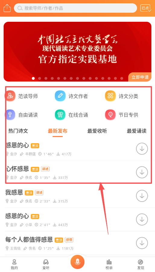 1、首先,在主界面可以方便地搜索导师、作者或作品,浏览热门诗文、最新发布等栏目,轻松开启你的诵读之旅。