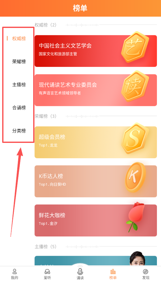 2、其次,在“榜单”页面,你可以查看各类排行榜,包括权威榜、主播榜、合诵榜等,了解当前热门诵读者和作品。