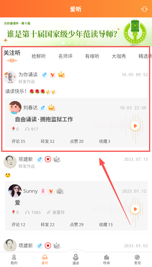 3、然后,在“爱听”页面,你可以关注他人的转发作品,查看相关评论、转发和点赞情况,,保持对诵读社区的关注和互动。