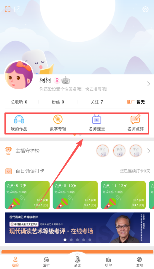 4、最后,在个人中心如“柯柯”的页面,你可以管理自己的作品、查看收听数据和粉丝情况,还能参与“百日诵读打卡”挑战。