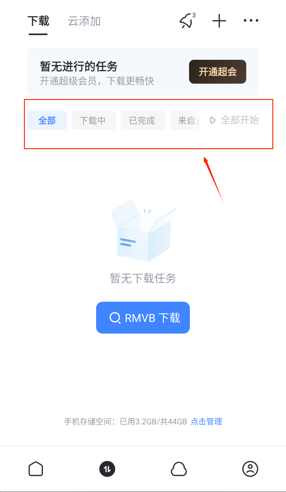 2、下载管理界面很直观,顶部显示下载状态和云加速卡信息,开通超级会员能提升下载体验,分类标签让你快速查看不同状态的任务呀。