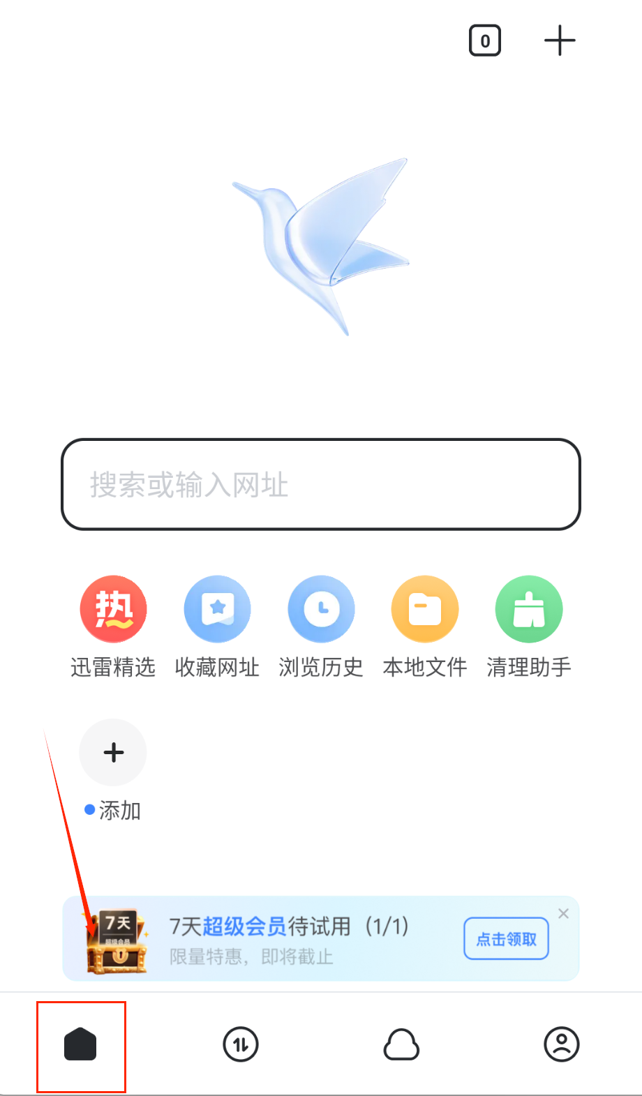 4、浏览器首页设计简洁,搜索栏直接输入网址或关键词,下方功能按钮包括迅雷精选和清理助手,添加按钮可以自定义快捷方式啦。
