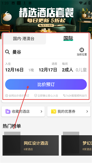 2、在酒店页填好目的地、日期等信息,点击【比价预订】按钮,就能看到各类酒店的价格对比哦。
