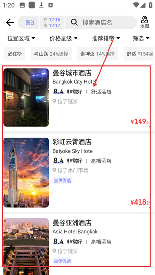 3、比价后会出现酒店列表,像【曼谷城市酒店】这类选项都能查看,按需选择心仪的酒店啦。