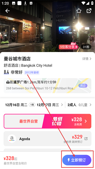 4、进入目标酒店详情页,确认信息后点击【立即预订】按钮,就能完成酒店的预订流程啦。