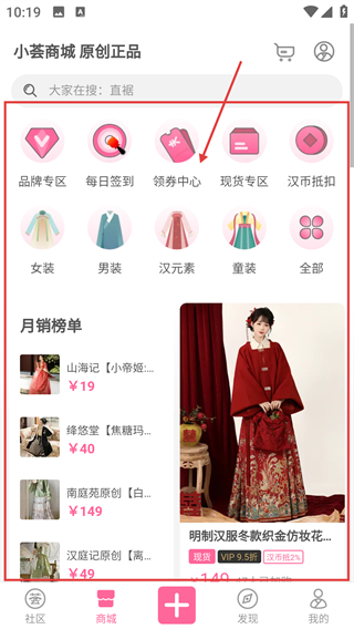 3、点底部【商城】按钮进入小荟商城,能看到各类汉服商品,月销榜单还能参考热门款哦。