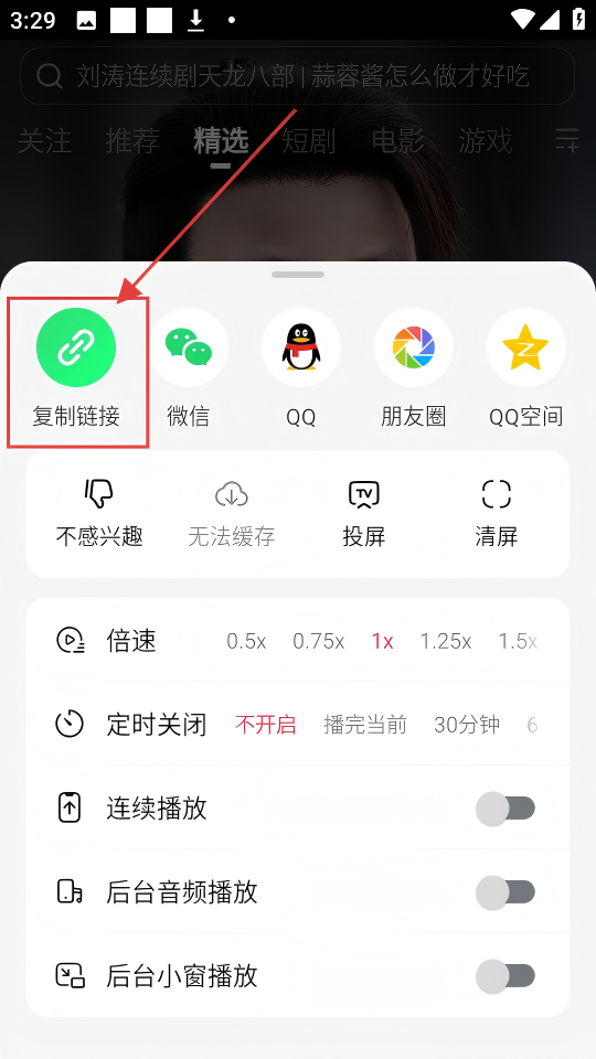 3、在分享选项菜单里,找到【复制链接】选项,点击它,就能把视频链接复制下来,超简单的。