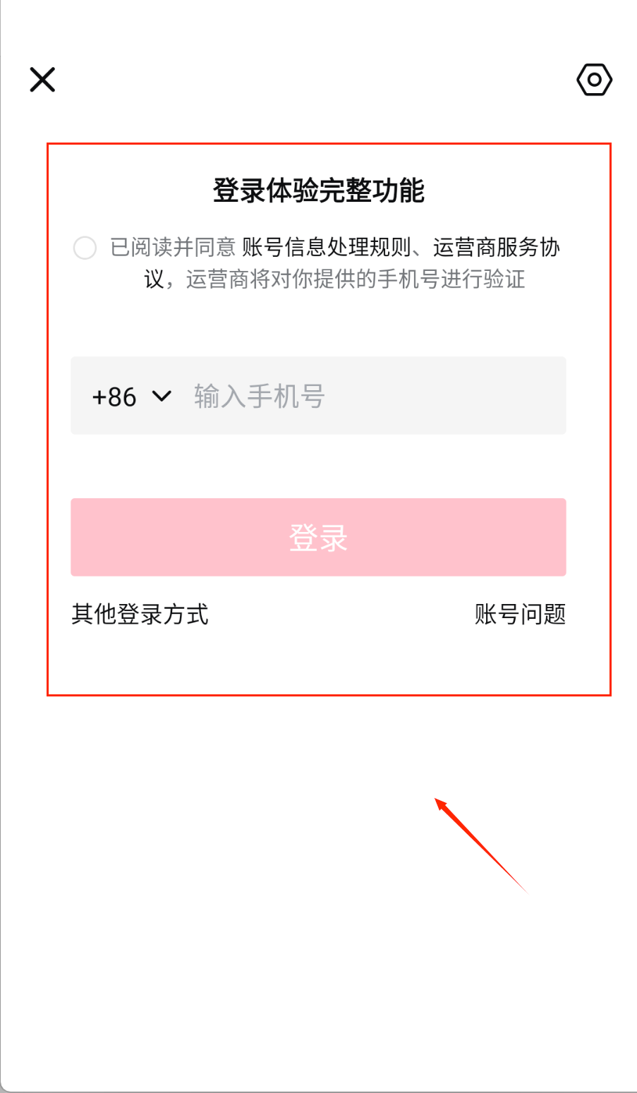 1、要使用完整功能需要先登录账号,打开软件在登录界面勾选同意协议,输入你的手机号后点击粉色登录按钮,系统会发送验证码完成验证。