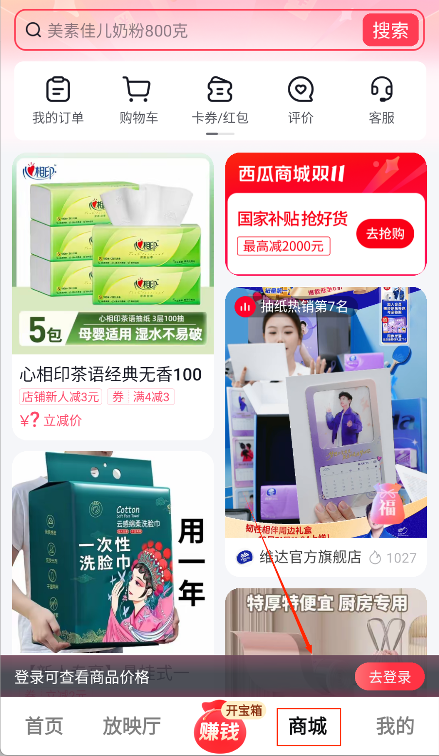 3、商城购物功能很实用,点击底部"商城"图标进入购物页面,能看到抽纸等商品促销信息,留意新人专享优惠券。