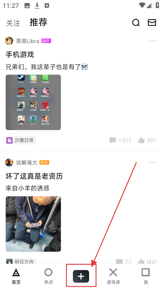 1、打开APP,点击底部加号按钮,进入内容创作页面,准备创作游戏相关内容啦。