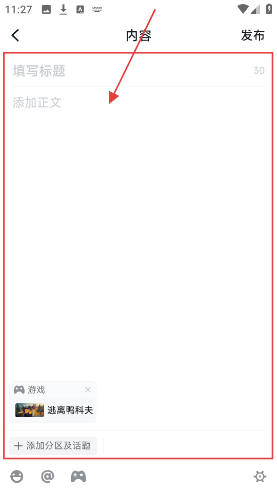 4、在创作页面填写标题和正文,即可完成游戏相关内容创作,准备发布啦。
