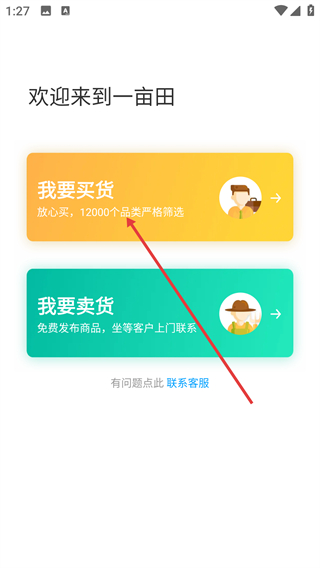 1、进入一亩田后,点击【我要买货】,可进入买货流程,开启农产品采购之旅。