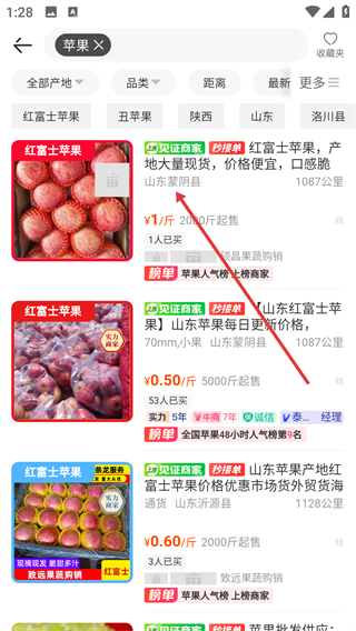 3、在苹果商品列表中,选择心仪的红富士苹果商品,点击进入商品详情页。