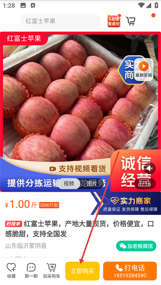 4、在红富士苹果商品详情页,确认商品信息后,点击【立即购买】,即可完成农产品采购操作。
