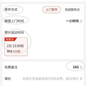 5、选择寄件方式,有“上门取件”与“自送服务点”,自行选择即可。如果是上门取什,需要选择期望上门时间。最后再选择包裹备注,确定后系统自动计算出寄件费用