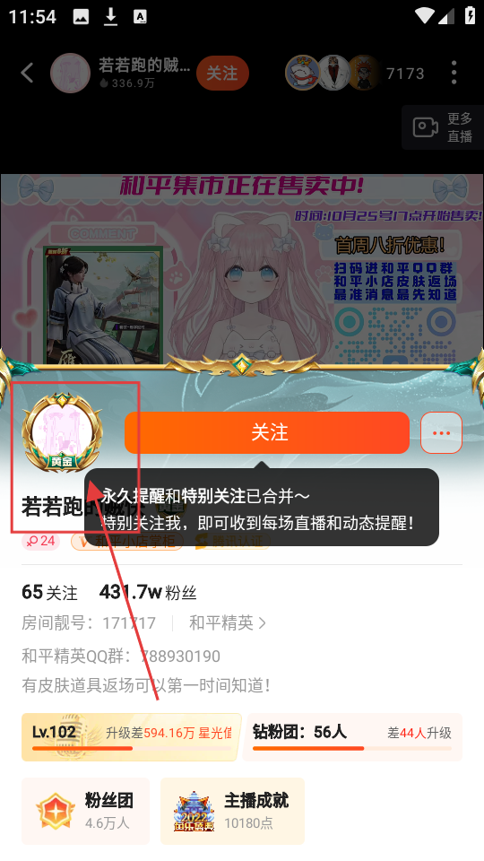 3、在主播个人主页可查看主播的粉丝数、等级等信息,还能关注主播哦。