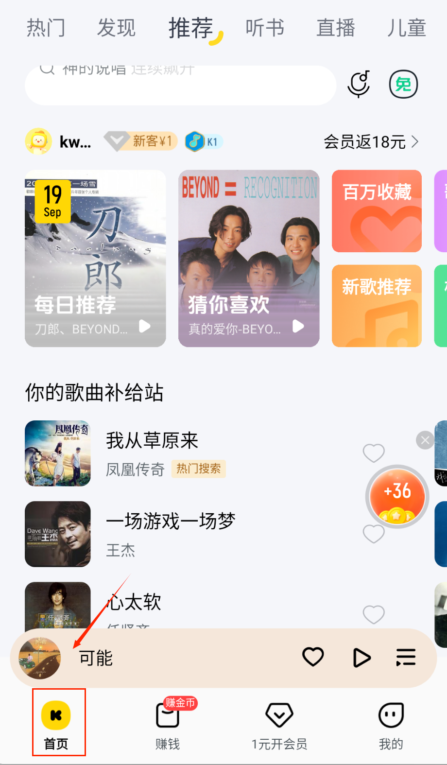 2、在推荐页面可以看到每日推荐版块展示的刀郎等歌手作品,还有猜你喜欢推荐的BEYOND等经典歌曲,右侧提供百万收藏。