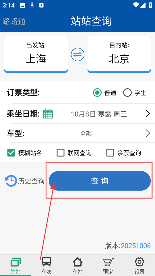 1、在站站查询页面,确认好出发站、目的站等信息后,点击【查询】按钮,就能获取相关车次信息啦。