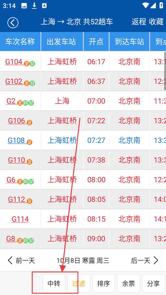 2、在车次列表页面,若需要中转出行,点击下方的【中转】按钮,可进入中转相关设置环节。